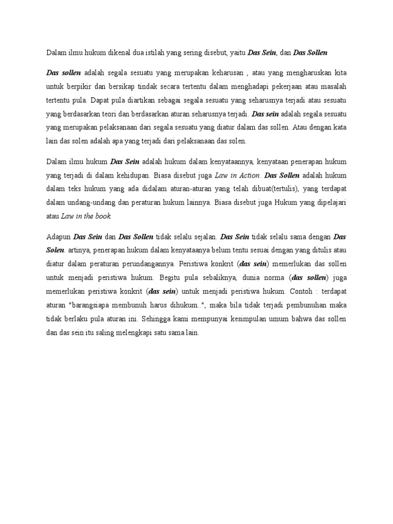 Contoh das sollen antara lain. Keduanya diambil dari bahasa jerman. Das sollen dan das sein adalah dua istilah dasar yang penting untuk diketahui dalam ilmu hukum. Apa yang harus ada nanti atau untuk singkatnya arti dari keduanya adalah yang ada dan yang seharusnya.