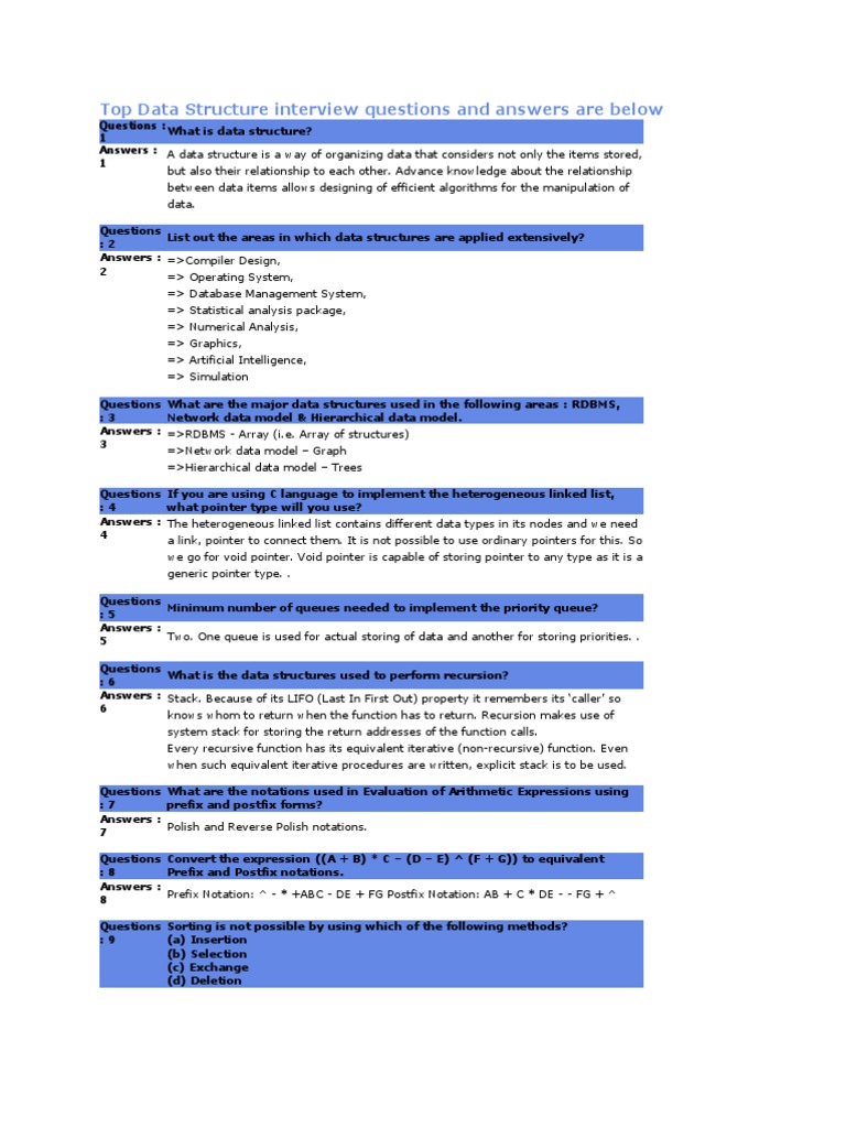 Prefix and suffix search. Data structures are mainly classified into two types. If you are not sure about the answer then you can check the answer using show answer button. Dear readers these data structures algorithms interview questions have been designed specially to get you acquainted with the nature of questions you may encounter during your interview for the subject of data structures algorithms as per my experience good interviewers hardly plan to ask any particular question during your interview normally questions start with some basic concept of.