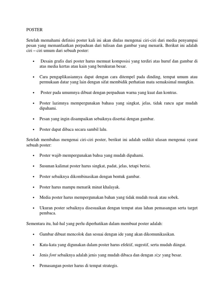 Desain grafis dari poster harus memuat komposisi yang terdiri atas huruf dan gambar di atas media kertas atau kain yang berukuran besar. Pengaplikasiannya dengan ditempel di dinding atau permukaan datar dengan sifat mencari perhatian mata sekuat mungkin. Mungkin kita sering kali melihat gambar gambar yang dilengkapi dengan kata kata pada kertas berukuran besar yang ditempelkan atau dipajang ditempat tempat ramai seperti di alun alun pasar mal dan lain lain. Pengertian poster tujuan ciri jenis cara membuat bahan prinsip contohnya.