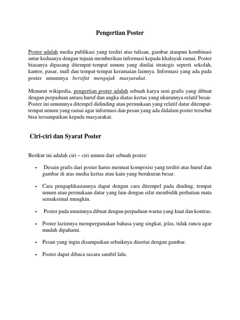 Karena itu poster biasanya dibuat dengan warna warna kontras serta kuat. Desain grafis dari poster harus memuat komposisi yang terdiri atas huruf dan gambar di atas media kertas atau kain yang berukuran besar. Pengertian poster tujuan ciri jenis cara membuat bahan prinsip contohnya. Cara pengaplikasiannya dapat dengan cara ditempel pada dinding tempat umum atau permukaan datar yang lain dengan sifat membidik perhatian mata semaksimal mungkin.